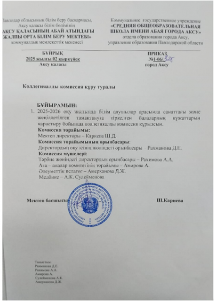 Коллегиалды комиссия құру туралы бұйрық №1-06/325 02.09.2025ж.