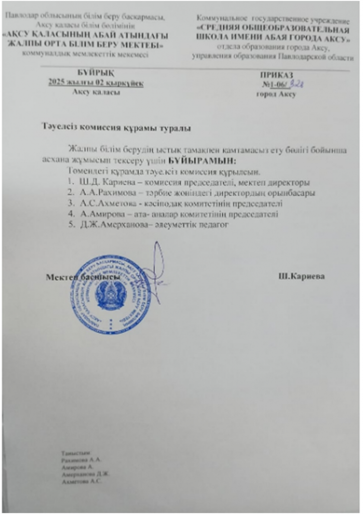 Тәуелсіз комиссия құрамы туралы бұйрық №1-06/326 02.09.2025ж.
