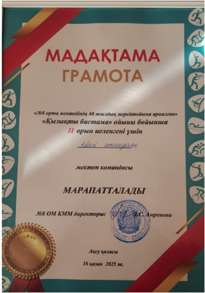 Бүгін 8 мектептің ұйымдастыруымен қала мектептерінің 4-ші сыныптары арасында «Қызықты бастама» ойыны өткізілді. Бұл іс- шара мектептің 40 жыл мерей тойына орай ұйымдастырылды. Ойын 8 кезеңнен құралған. Өте қызықты болды. Команда 5ұл, 5 қызды құрады. Ептілікті, жылдамдықты, шыдамдылықты талап ететін додада, біздің мектептің оқушылары жүлделі 2 орынды иеленді. Командалар тәтті сыйлықтар мен грамотамен марапатталды. Тек алға✊️ құттықтаймыз!!!💐💐💐