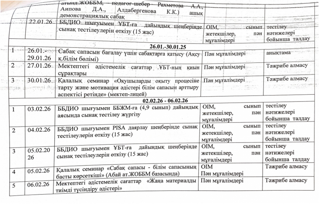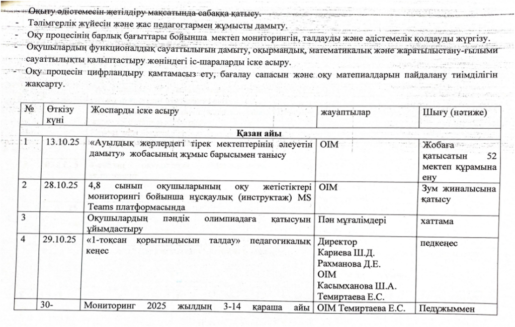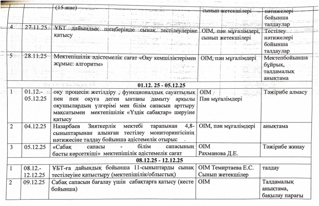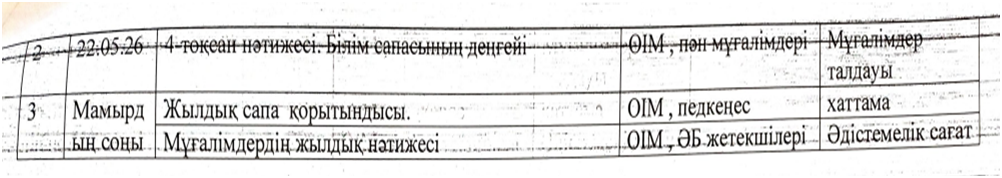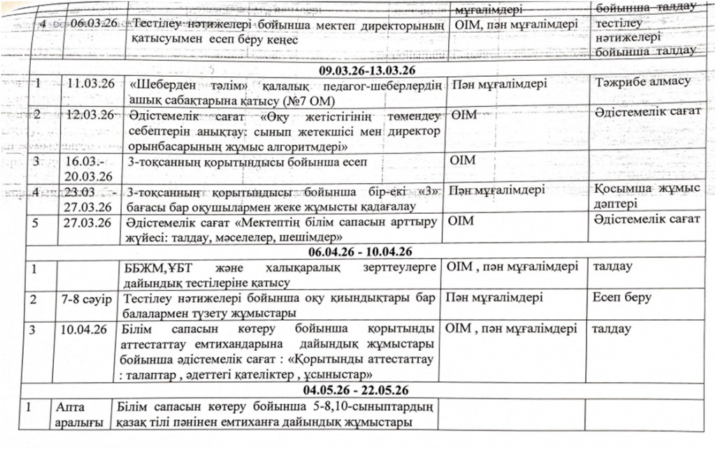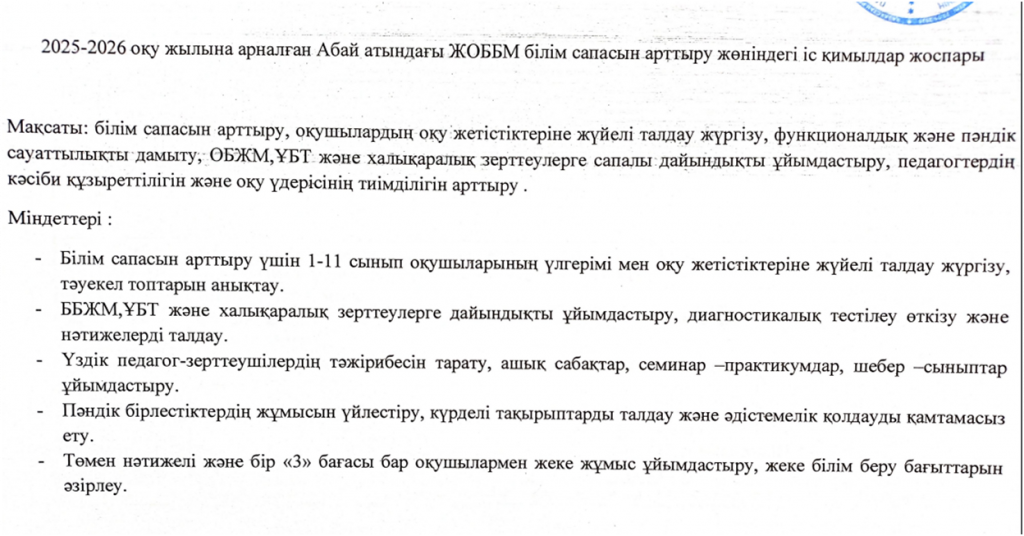 Білім сапасын арттыру бойынша білім басқармасының, білім бөлімінің жоспары негізінде мектепішілік жоспар құрастырылды. Жоспарға сәйкес іс-шаралар өткзілетін болады. Әдістемелік жұмыс