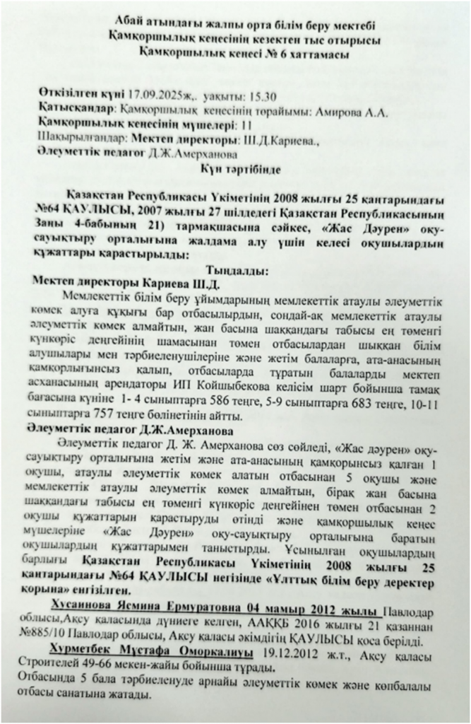 Қамқоршылық кеңесі №6 хаттамасы 17.09.2025ж.
