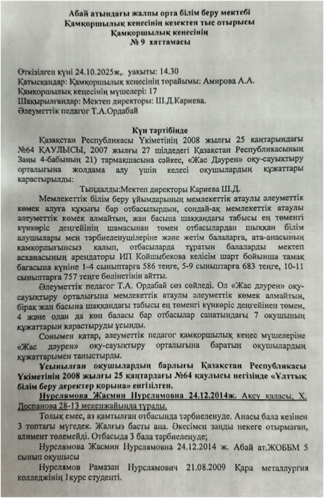 Қамқоршылық кеңесінің №9 хаттамасы 24.10.2025ж.