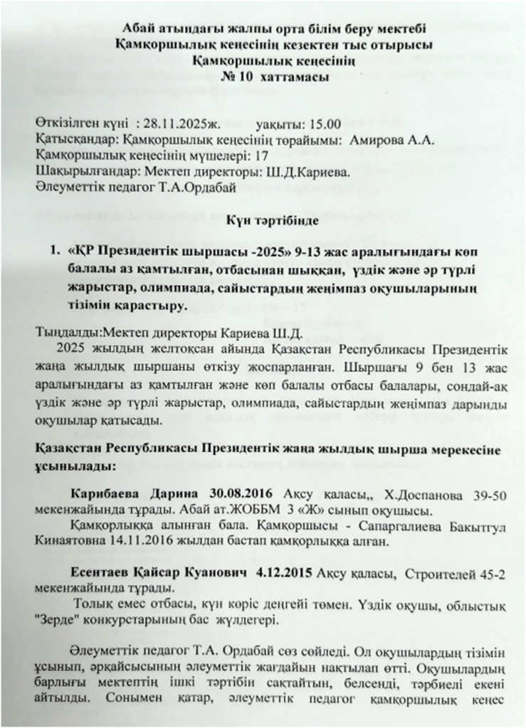 Қамқоршылық кеңесінің №10 хаттамасы 28.11.2025ж.