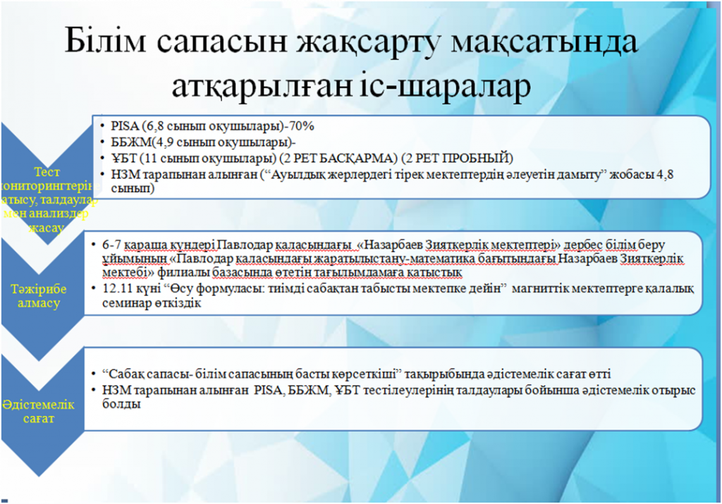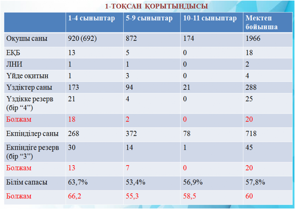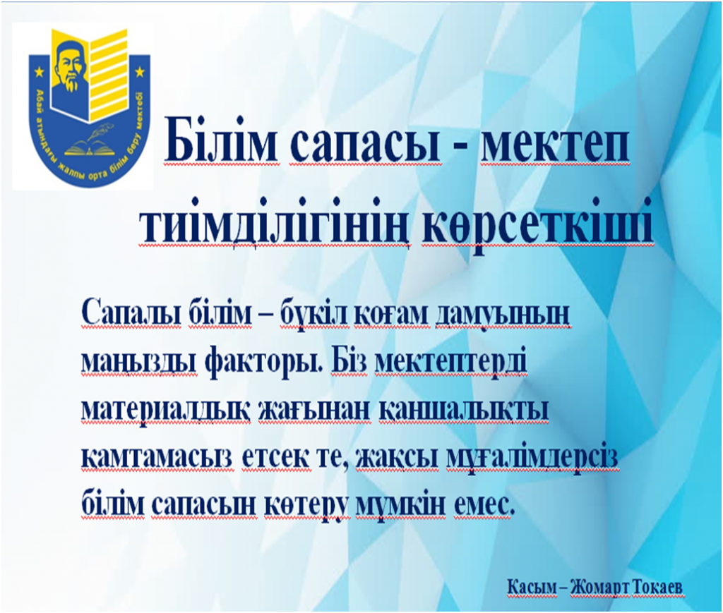 1-тоқсан қорытындысы мен атқарылған жұмыстар Әдістемелік жұмыс «Білім сапасы — мектеп тиімділігінің көрсеткіші» Сапалы білім – бүкіл қоғам дамуының маңызды факторы. Біз мектептерді материалдық жағынан қаншалықты қамтамасыз етсек те, жақсы мұғалімдерсіз білім сапасын көтеру мүмкін емес. Қасым – Жомарт Тоқаев