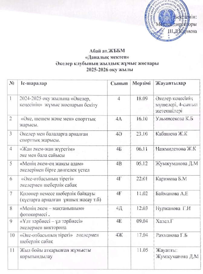 «дАНАЛЫҚ МЕКТЕП» ӘКЕЛЕР КЛУБЫНЫҢ ЖЫЛДЫҚ ЖҰМЫС ЖОСПАРЫ 2025-2026 ОҚУ ЖЫЛЫ