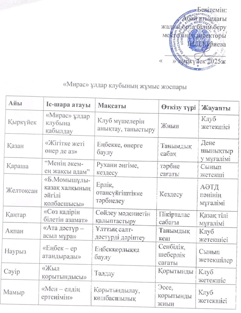 «МИРАС» ҰЛДАР КЛУБЫНЫҢ ЖҰМЫС ЖОСПАРЫ