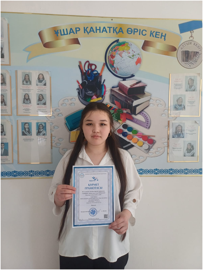 Айнабек Гүлназ (пән мұғалімі: Рахманова Д.Е.) «Шешендік өнер» бағыты бойынша қатысты. Байқау қорытындысы бойынша оқушылар құрмет грамотасымен марапатталды. Жетістіктеріңіз құтты болсын!Құттықтаймыз!!!